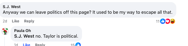 The other women on Gen X Swifties started a conversation with the “no politics” women. Not a “You’re stupid!” shouting match but a calm conversation that clearly stated, Taylor is political and so being a Taylor Swift fan is political. That Taylor has strongly come out for women’s rights and LGBTQ rights and against politicians who oppose those civil rights and you can’t separate these things. To be for Taylor is to be for women’s and queer rights and the taking of a strong stance against those that would suppress those rights is in line with Swift’s values of equality. People began posting memes of friendship bracelets that said, “In our Kamala era,” and repurposing Swift lyrics, like, “Kamala’s a relaxing thought.” And those “no politics” women didn’t bail. They stayed and listened.